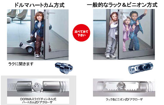 ドアを開けるときには一転して、軽い力でドアを動かすことが出来なければならない。この相異なる2つの性能を満たすことがドアクローザとしての必要十分条件となるわけだが、力学的に考えてもこの2つの性能は背反の関係にあり、多くのドアクローザではうまい具合にいっていない。