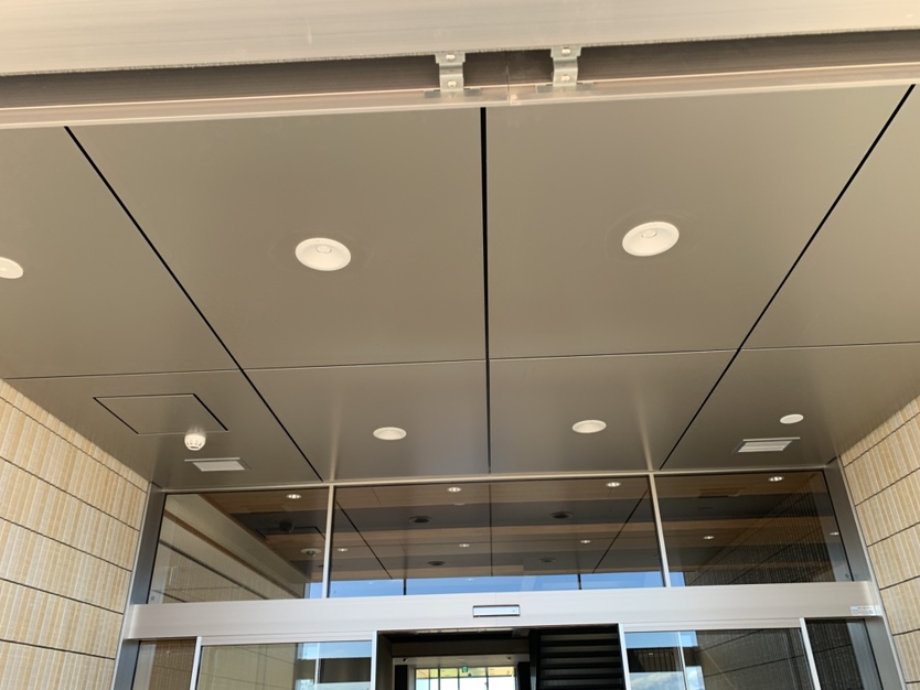 杉田エースに中途採用で入社し数年が経過しました。前職はタイヤメーカーの営業をしており、異業種への転職でしたが、経験を積み、年々商品知識も高まり、今仕事がとても楽しいです。今回ご紹介する事例は普段から大変お世話になっている施工店様からいただいた県内某所の新庁舎のアルミ樹脂積層複合板を使用した庇部分の化粧パネルの設置工事です。営業がスタートした時点では別の商品が候補に挙がっていたのですが、予算が合わなかったことや納まりに問題があったため、別の商品を私の方からご提案させていただきました。